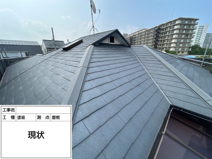 屋根表面は紫外線や雨風の影響でチョーキング現象が発生し、防水性能の低下が見られる状態でした。