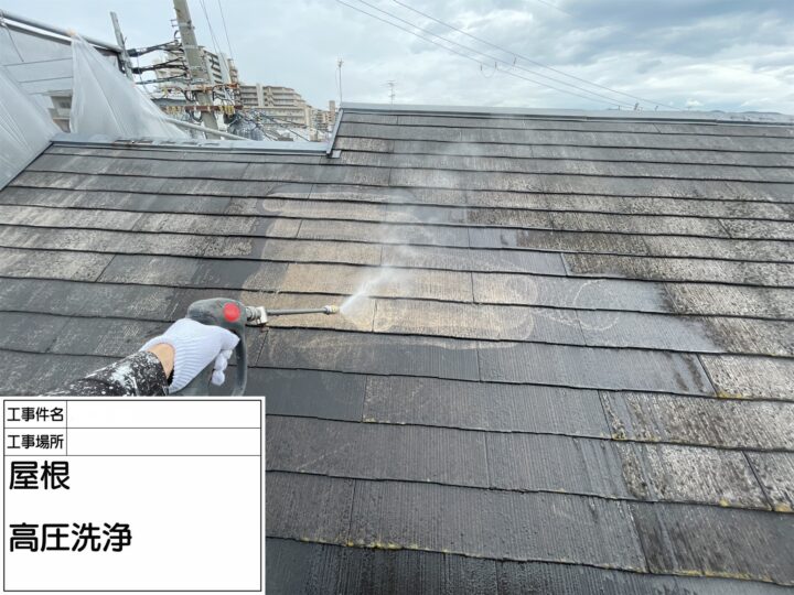 高圧洗浄で汚れ・旧塗膜をしっかり除去し、下地補修を実施。