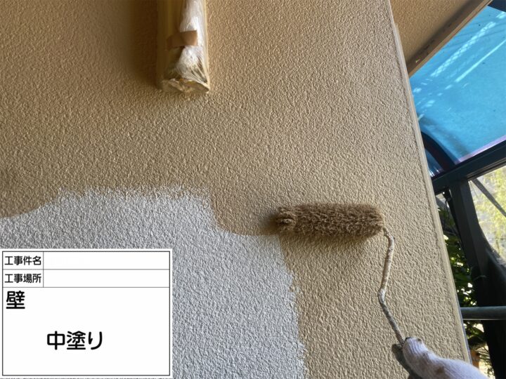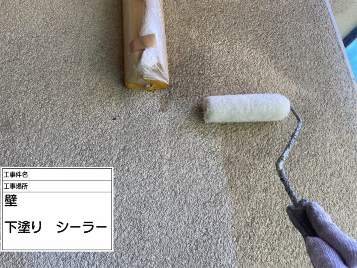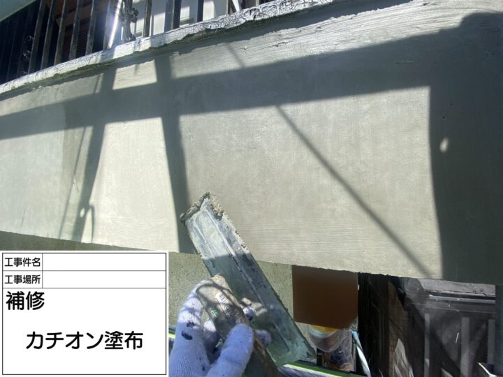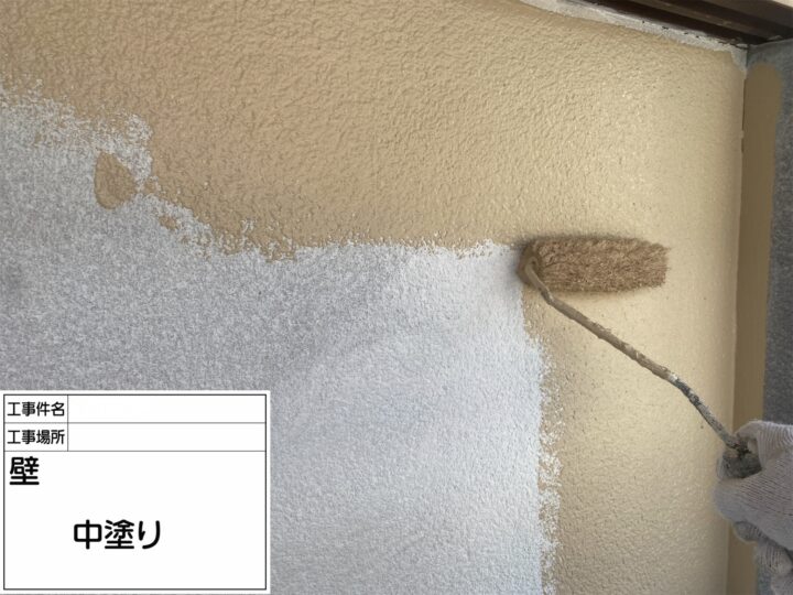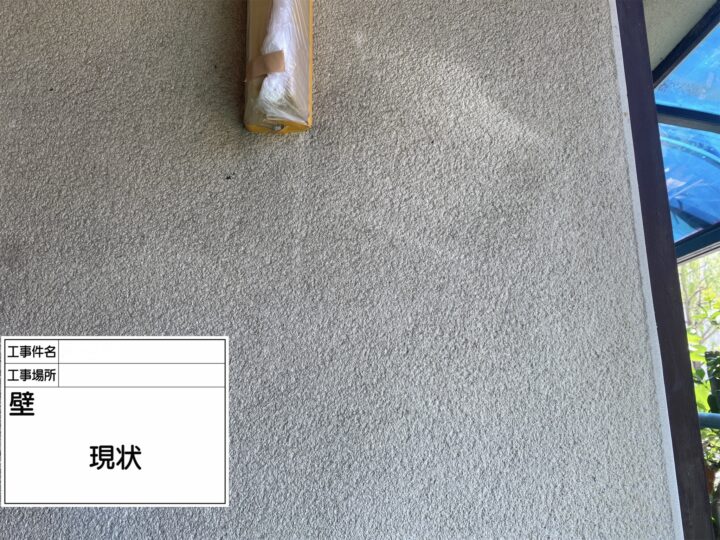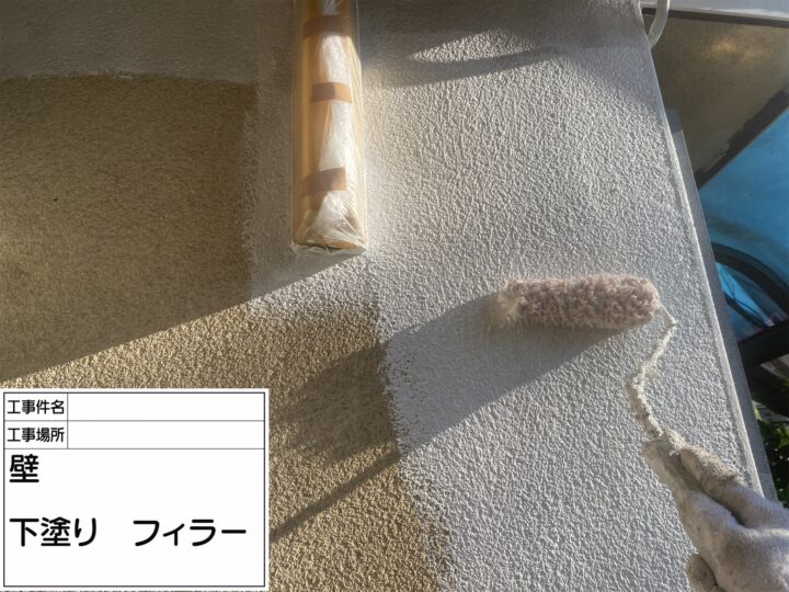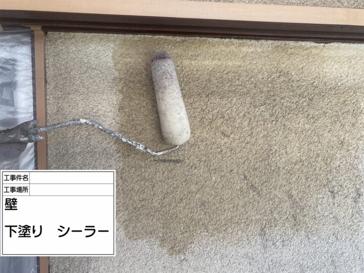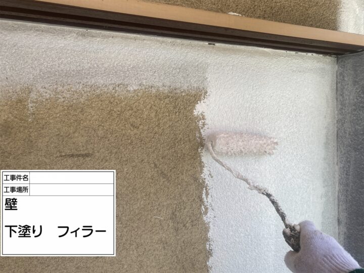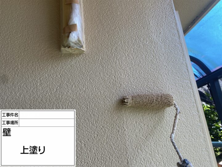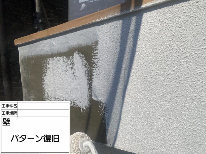 下地がかけ落とし壁のため、密着力に優れた専用下塗り材を使用し、上塗りには耐候性・防汚性に優れた塗料を採用。